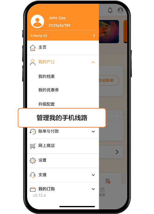 登录 MyUMobile App,导航至主菜单,然后单击“我的户口”下的“管理我的帐户”。
