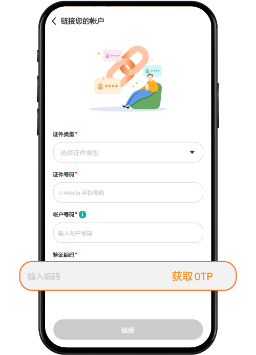 点击 "链接我的所有帐户",然后填写与 U Mobile 手机或宽频配套相关的详细信息。
