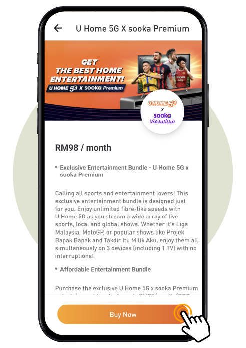 U Home 5G x sooka Premium is offered exclusively to active U Home 5G subscribers via the MyUMobile App. If you are not a subscriber, you may register at https://shop.u.com.my/ or through any of our outlets or dealers.