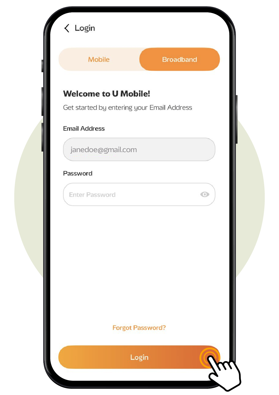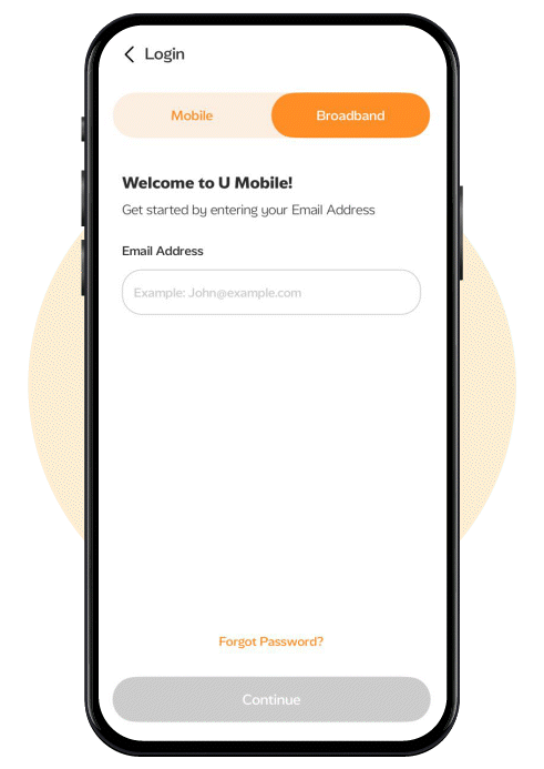 Launch the MyUMobile App, tap "Broadband", enter your registered email and password, then tap "Login".