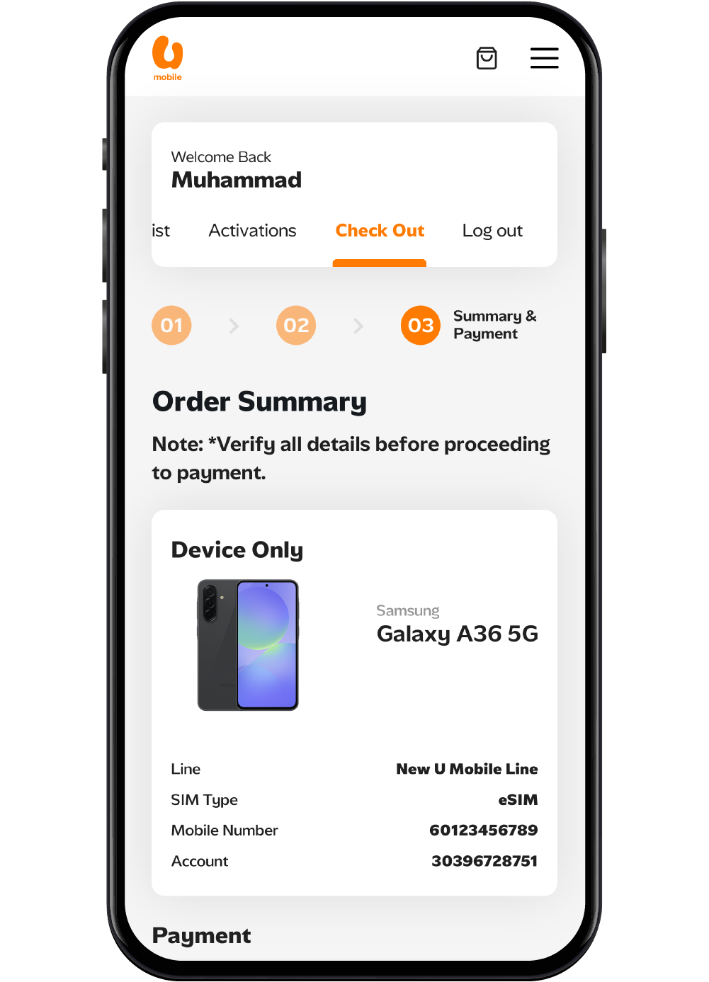 Proceed with the verification process and complete the eSIM activation payment.