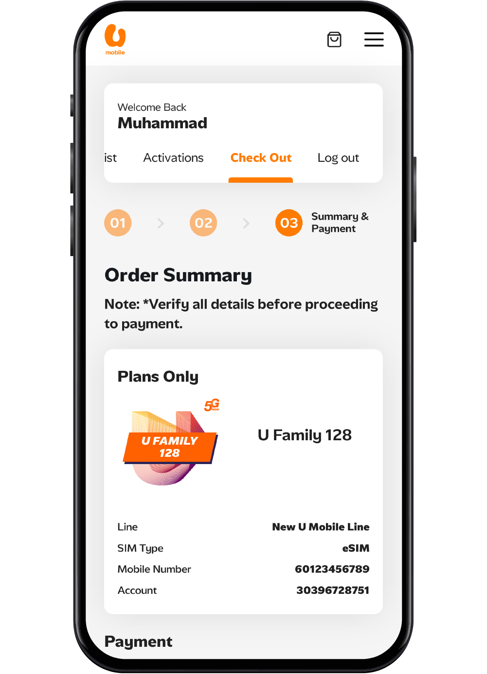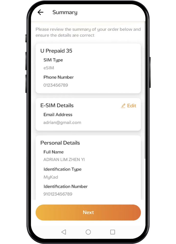 Pick your preferred mobile plan and start your journey with a new U Mobile line. Complete the eKYC process using your NRIC or passport and facial recognition.