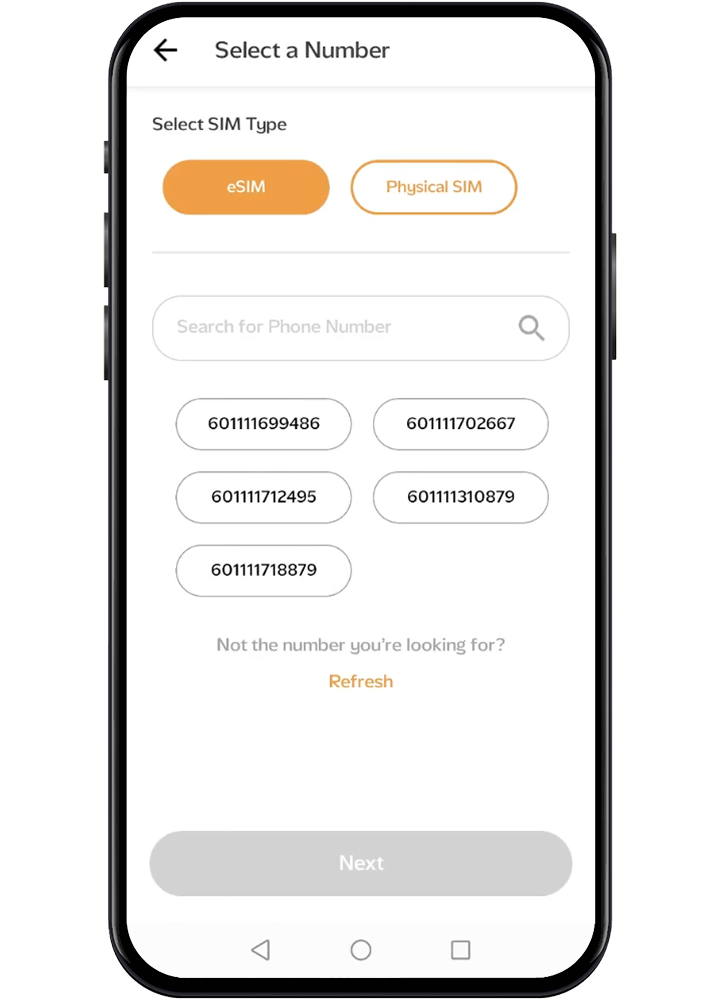 Select your desired mobile number and select eSIM for quick, hassle-free activation.